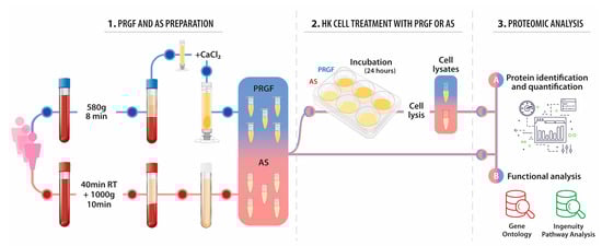 The study design is shown schematically. First, the two blood derivatives, PRGF and AS, were obtained. On the one hand, HK cells were incubated with these formulations to assess their response to each blood derived product by proteomic techniques. On the other hand, both PRGF and AS preparations were characterized by the same proteomic techniques.