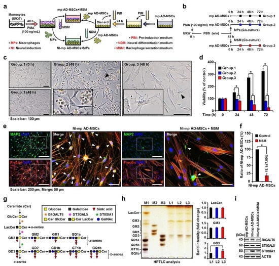 Expression patterns of gangliosides in the in vitro xenogeneic stem cell transplantation immune model. (a) The experimental setup to mimic xenogeneic stem cell transplantation in vitro. Human U937 cells were either used as monocytes or differentiated into MPs by incubation with 100 ng/mL PMA. (b) We used MPs and MSM, which were collected for 48 h in serum-free medium. Groups 1, 2, and 3 indicate the control, MP co-culture, and MSM co-culture, respectively. In a direct co-culture system, MPs were directly added to mp AD-MSC cultures. (c) Phase-contrast images of the co-culture system between mp AD-MSCs with MPs or MSM for 48 h. Arrowheads indicate enlarged images. (d) Cell proliferation was quantified by an MTS assay at 24, 48, and 72 h post-co-culture. Data are presented as mean percentage levels ± SD (n = 3; * p < 0.05). (e) Immunofluorescence staining of neuronal induction (NI)-mp AD-MSC culture (control) and co-culture with MSM using MAP2-FITC, F-actin, and DAPI. White squares indicate enlarged merged images; arrowheads indicate induced neural-like cells. (f) Variations in the cell count of NI-mp AD-MSCs were quantified for co-cultures with or without MSM after 48 h. Data are presented as mean percentage levels ± SD (n = 3; * p < 0.05). (g) General scheme for ganglioside synthesis; steps are also reversible. G: ganglioside; M: monosialo; D: disialo; numbers denote carbohydrate sequence. GlcCer: glucosylceramide; LacCer: lactosylceramide; GalNAc: N-acetylgalactosamine; B4GALT6, beta-1,4-galactosyltransferase 6; ST3GAL5, ST3 beta-galactoside alpha-2,3-sialyltransferase 5; ST8SIA1, ST8 alpha-N-acetyl-neuraminide alpha-2,8-sialyltransferase 1. (h) HPTLC of gangliosides in mp AD-MSCs (L1), NI-mp AD-MSCs (L2), or co-cultures with MSM (L3). M, marker; L, line; M1, adult mouse brain gangliosides; M2 and M3, ganglioside standard markers (left panel); quantification of band intensity of LacCer, GM3, and GD3 (right panel). Data are presented as fold changes ± SD (n = 3; * p < 0.05). (i) Western blots for gangliosides LacCer, GM3, and GD3 synthase. Expression patterns of B4GALT6, ST3GAL5, and ST8SIA1 in mp AD-MSCs, NI-mp AD-MSCs, or co-cultures with MSM. ACTB was used as a loading control.