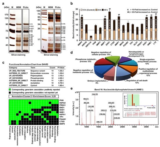 SDS-PAGE analysis and verification of high-abundance proteins in MSM. (a) SDS-PAGE and silver staining: pre-stained protein size marker (lane M), secretomes from cultured medium of active MPs (lane MSM), and sample picking from SDS-PAGE gel spots for peptide mass fingerprinting (PMF) analysis (lane Picks). N.D., not detected. (b) Quantification of protein bands from SDS-PAGE gels using Image J software. Data are presented as mean fold changes ± SD (n = 3; #, more than 10-fold increase versus the control, p < 0.05; ##, more than 20-fold increase versus the control, p < 0.05). (c) Two clusters were identified using the DAVID functional annotation clustering tool. Annotated cluster represents a kappa value > 0.35 and overlap = 3. Similarity scores ranged from high (>1) to low enrichment (<0.25). (d) Illustration of identified proteins analyzed by gene ontology tool. (e) PMF spectrum of NME1. Spectral masses (in mass per charge unit, m/z) obtained by MALDI-TOF MS were analyzed by bioinformatics using the Mascot and Profound search engines. The x-axis represents the mass-to-charge ratio (m/z), and the y-axis represents the relative abundance. The probability-based Mowse scores were obtained using the Mascot search engine. Among predicted proteins with differential Mowse scores shown as multiple bars on the x-axis, only proteins with Mowse scores > 68 were considered significant, which was 142 (p < 0.05) for NME1 protein. Red marks indicate peptides identified by mass fingerprinting that match calculated molecular weights. All protein identifications are provided in Supplementary Figure S2 and Table S2.