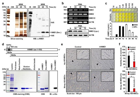 Quantitative analysis of secretome NME1 protein and functional evaluation of rhNME1. (a) MSM was prepared at various times, separated on SDS–PAGE, and subjected to silver staining or Western blotting using NME1 antibody. M, pre-stained protein size marker; CM, conditioned medium; N/S, non-specific; Sec., secretion; α-, anti-. (b) Reverse transcription polymerase chain reaction (RT-PCR) analysis of NME1, NME2, and NME1/2 mRNA in PMA-activated MPs (upper panel). Whole-cell lysates were prepared and subjected to Western blotting using NME1 antibody (lower panel). Lys., lysates. ACTB was used as a loading control. (c) ELISA results of MSM or MP intracellular hNME1. Standard color (top panel) and time-dependent color changes of samples (MSM and cells) (middle panel). Absorbance was recorded and quantified by conventional microplate readers (lower panel). The results shown are representative of three independent experiments. Std., standard (ng/mL). (d) The schematic structure and production of rhNME1 or His-rhNME1 proteins. The recombinant proteins consist of a 6 × His-tag and an extracellular domain of hNME1 with 153 amino acids (upper panel). The pET-28B (+)-hNME1 plasmids were transformed into Escherichia coli strain BL21 (DE3) and induced by isopropyl ß-D-1-thiogalactopyranoside. His-rhNME1 protein expression was analyzed by SDS-PAGE followed by Coomassie brilliant blue staining (lower left panel). The His-rhNME1 proteins were purified, subjected to SDS-PAGE followed by Coomassie brilliant blue staining (lower middle panel), and subjected to Western blot analysis with a His antibody (lower right panel). M, pre-stained protein size marker; CBS, Coomassie brilliant blue staining. (e) Phase-contrast images of cultured mp AD-MSCs and NI-mp AD-MSCs with or without rhNME1 (4 ng/mL). Arrowheads indicate enlarged images. (f) Cell viability was quantified by an MTS assay on mp AD-MSCs with or without rhNME1 (upper panel). The variations in the cell count of NI-mp AD-MSCs were quantified for co-cultures with or without rhNME1 (lower left panel). Data are presented as mean percentage levels ± SD (n = 3; * p < 0.05).
