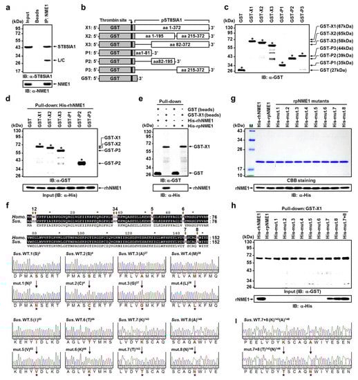 Identification of hNME1 as a novel pST8SIA1-binding protein using IP and pull-down assay. (a) NME1 interacts with ST8SIA1. U937 cells were lysed under non-denaturing conditions, and 500 μg of total lysate protein was subjected to IP with α-NME1. Precipitated proteins were resolved by SDS-PAGE, and IB analysis probed for ST8SIA1 or NME1 as indicated. Arrows indicate immunoreactive bands; the precipitated ST8SIA1 band is denoted with an asterisk. Beads, beads only (IgG); L/C, light chain. (b) The rpST8SIA1 constructs. GST fusion proteins were generated by cloning PCR-amplified ST8SIA1 sequences into the pEX-N-GST expression vector. Domain structure of the full-length GST-ST8SIA1 protein and the various deletion mutants used. X1-3, transcript variants 1–3; P1–3, partial transcripts 1–3; aa, amino acids. (c) Equivalent amounts of purified recombinant GST, GST-ST8SIA1, or GST-ST8SIA1 deletion mutants were analyzed by SDS-PAGE followed by IB analysis with the specific α-GST antibody. (d) GST pull-down assay on purified-His-rhNME1 incubated with equivalent amounts of GST, GST-X1, GST-X2, GST-X3, GST-P1, GST-P2, and GST-P3. Results were analyzed by SDS-PAGE followed by IB analysis with the specific α-GST and α-His antibody. The ST8SIA1 domains bound by NME1 are denoted with an asterisk. (e) GST pull-down assay on His-rhNME1 or purified-His-tagged recombinant porcine NME1 incubated with equivalent amounts of GST and GST-X1 beads. Results were analyzed by SDS-PAGE followed by IB analysis with the specific α-GST and α-His antibody, which showed that ST8SIA1 is attached only to hNME1 and not pNME1. (f) Comparison of the amino acid sequences of Homo sapiens (Homo.) and Sus scrofa (Sus.) NME1. The nucleotides Asparagine 3 (N3), Cysteine 4 (C4), Glycine 37 (G37), Leucine 38 (L38), Valine 53 (V53), Lysine 66 (K66), Threonine 143 (T143), and Asparagine 148 (N148) in the Homo. NME1 sequences were changed to Serine 3 (S3), Serine 4 (S4), Alanine 37 (A37), Methionine 38 (M38), Isoleucine 53 (I53), Threonine 66 (T66), Lysine 143 (K143), and Alanine 148 (A148) in the Sus. NME1 sequences, respectively. The DNA sequenced by Bionics (Bionics Co., Seoul, Korea) was analyzed using FinchTV 1.4.0 (Geospiza, Inc., Seattle, WA, USA). Sequence analysis results showed the Sus. NME1 cDNA and point-mutant NME1 cDNA in WT and mutants (mut.), respectively. (g) The expression of His-rhNME1, His-recombinant sus NME1 (rsNME1), and His-mut. 1–8 proteins were analyzed by SDS-PAGE followed by Coomassie brilliant blue staining and subjected to IB analysis with α-His antibody. (h) GST pull-down assay for His-rhNME1 or His-rsNME1, His-rsNME1, His-mut. 1–8, and His-mut. 7+8 incubated with equivalent amounts of GST-X1. Results were analyzed by SDS-PAGE followed by IB analysis with the specific α-GST and α-His antibody, which showed that rNME1 attached only to His-rhNME1, His-mut. 7, His-mut. 8, and His-mut. 7+8. (i) The amino acid sequence of His-mut. 7+8. The nucleotides 7. Threonine 143 (T143) and 8. Asparagine 148 (N148) in the Homo. NME1 sequences were changed to 7. Lysine 143 (K143) and 8. Alanine 148 (A148) in the Sus. NME1 sequences, respectively.