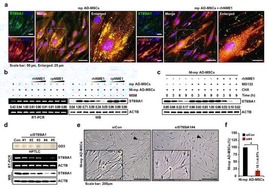 Immunocytochemistry of mp AD-MSCs with and without rhNME1 treatment. (a) Co-localization of endogenous ST8SIA1 in the Golgi apparatus in mp AD-MSCs or endogenous ST8SIA1 with exogenous rhNME1. Immunofluorescence microscopy results show mp AD-MSCs fixed and stained with antibodies against ST8SIA1 (green), cis-Golgi marker GM130 (red), and ectopic His-tagged rhNME1 (red). DAPI was used for nuclear counter staining. Overlapping staining (yellow) demonstrates the co-localization of the two proteins, and white squares indicate enlarged merged images. (b) Reduction in ST8SIA1 expression by rhNME1, rsNME1, and MSM treatment in mp AD-MSCs or NI-mp AD-MSCs. RT-PCR (left panel) and Western blots (right panel) for ST8SIA1 protein in rhNME1 or rsNME1-treated NI-mp AD-MSCs. Only rhNME1 (1, 2, and 4 ng/mL), not rsNME1, dose-dependently significantly decreased ST8SIA1 protein levels in NI-mp AD-MSCs; neither rhNME1 nor rsNME1 suppressed ST8SIA1 mRNA in NI-mp AD-MSCs. ACTB was used as a loading control. (c) ST8SIA1 is regulated by the proteasome and rhNME1. Western blot analysis determined the effects of rhNME1, MG132, and cycloheximide on ST8SIA1 protein accumulation. Protein extracts were prepared from NI-mp AD-MSCs treated with rhNME1 (4 ng/mL) or MG132 (10 uM), cycloheximide (150 nM), or a combination of the two. Equal protein loading was confirmed with ACTB antibody. (d) The knockdown of ST8SIA1 siRNA. ST8SIA1-specific siST8SIA1 or siCon was transfected into mp AD-MSCs. After transfection with siST8SIA1 (50 nM) for 48 h, ST8SIA1 expression was evaluated using HPTLC, RT-PCR, and Western blotting. ACTB was used as a loading control. All siRNA sequence information is provided in Supplementary Figure S4 and Table S3. #, siRNA number. (e) Phase-contrast images of transfected NI-mp AD-MSCs with siCon or siST8SIA1 (#4). Arrowheads indicate enlarged images. (f) Variations in the cell count of NI-mp AD-MSCs were quantified for NI-mp AD-MSCs transfected with siCon or siST8SIA1#4 (si#4). Data are presented as mean percentage levels ± SD (n = 3; * p < 0.05).