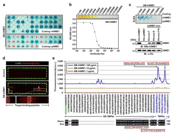 NB-hNME1 production and NME1 antigenic epitope mapping. (a) Detection of hNME1 antigen-specific antibodies by phage ELISA. Of 43 different colonies, 31 colonies (black number) were positive for rhNME1. Of these 31 rhNME1-positive colonies, 17 were used in the experiment; 15 colonies (red number) negative for rsNME1 were excluded. (b) Titer determination of NB-hNME1 by ELISA. The ratio of NB-hNME1 absorbance values at 450 nm. (c) The specificity of the hNME1 antigen in NB-hNME1 was confirmed by ELISA and IB analysis. Results were analyzed by SDS-PAGE followed by IB analysis with the NB-hNME1 and α-His antibody, which demonstrated that NB-hNME1 is attached only to His-rhNME1, His-mut. 7, His-mut. 8, and His-mut. 7+8. α-His antibody was used as a loading control. (d) The elongated antigen sequence was translated into 15 amino acid peptides with a peptide–peptide overlap of 14 amino acids. The resulting peptide microarrays contained 152 different peptides printed in duplicate (304 peptide spots) and were framed by additional HA (YPYDVPDYAG, 58 spots) control peptides. Goat α-human IgG (Fc) was used as secondary antibody; mouse monoclonal α-HA antibody was used as control. White squares indicate NB-hNME1-binding peptide; arrows indicate enlarged images. (e) Identification of a binding region of hNME1 interacting with NB-hNME1. A peptide array of hNME1 was exposed to NB-hNME1 at concentrations of 1, 10, and 100 µg/mL. The intensity plot of the peptide array signals appears as peaks with corresponding regions of hNME1. The two highest peaks are denoted with arrows in the graph, indicating two epitope-like spot patterns formed by adjacent peptides with the consensus motifs KEIGLWFHPEELVDY and ELVDYTSCAQNWIYE. GS (green text), neutral linkers at the C- and N-terminus; NS-TBPSs, nonspecific target-binding peptide sequences; TBPSs, target-binding peptide sequences.