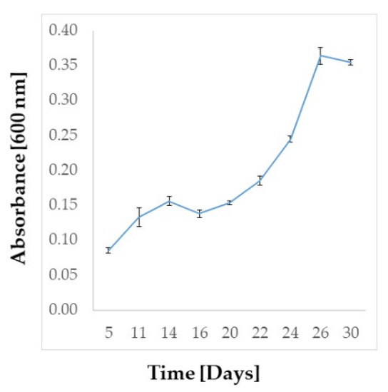 Batch growth of Amphidinium carterae LACW11 in f/2 medium monitored at λ = 600 nm.