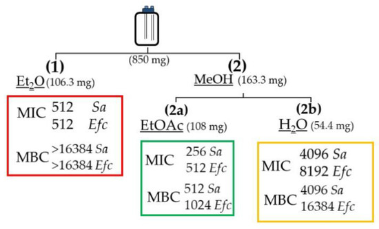 Representative scheme of Stage-1: three extracts obtained from Amphidinium carterae LACW11 biomass (freeze dried, mg) were screened against Gram-positive bacteria. Activities are expressed in µg/mL. Sa, Staphylococcus aureus ATCC 25,293; Efc, Enterococcus faecalis ATCC 29,212. The bioactivities of each extract are highlighted with different colours.