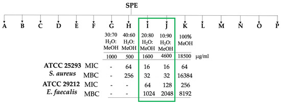 Representative scheme of Stage-2: fractions obtained via C18 Solid Phase Extraction (SPE) of the EEtOAc from Amphidinium carterae LACW11, which were tested against Gram-positive bacteria. Activities are expressed in µg/mL. The bioactivities of fractions I and J are highlighted.