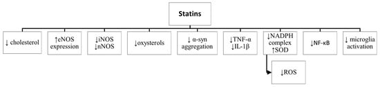In addition to improvement of vascular functions, statins can reduce oxidative stress, which is presumably involved in the pathogenesis of several neurodegenerative diseases, such as AD and PD []. Oxidative stress highly correlates with overproduction of reactive oxygen species (ROS), synthesised mainly by NADPH-dependent oxidases [,]. ROS may be converted into a reactive hydroxyl ion (OH-) and peroxynitrite, which produce damage to cell constituents: lipids, proteins as well as nucleic acids, thus inducing ischaemic cell death []. Moreover, oxidative stress upregulates non-enzymatic production of oxidised cholesterol derivatives—oxysterols, i.e., 7-ketocholesterol (7-K), 7β-hydroxycholesterol (7β-OH), 5α,6α-epoxycholesterol (α-EPOX) and 5β,6β-epoxycholesterol (β-EPOX) []. In PD, 7-K and 7β-OH plasma levels (along with an enzymatic product of cholesterol oxidization—27-hydroxycholesterol) were significantly elevated compared to the control group, indicating an association between PD and oxidative stress []. Statins can downregulate ROS production by inhibiting NADPH-complex [,]. Furthermore, pitavastatin was shown to protect against ischeamia-induced neuronal damage by preservation of the antioxidant enzyme—superoxide dismutase (SOD) []. On the other hand, inhibition of HMG-CoA reductase may result in a decrease in isoprenoid ubiquinone or coenzyme Q10 levels that perform antioxidative functions [].