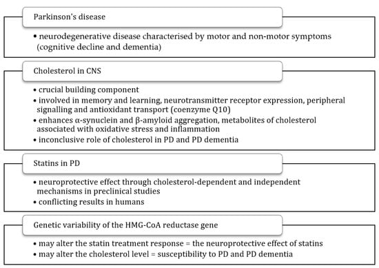 Numerous issues have arisen concerning the available information. First, several of studies did not analyse a vital confounding factor, i.e., LDL-C level. Huang et al. indicated that high LDL-C levels, established to be associated with lower PD occurrence, trigger statin prescription []. Thus, statin advantages may result from beneficial effects of higher cholesterol levels, and to a lesser extent to statin treatment itself. In addition, regarding high LDL-C levels as a PD protective factor, it is likely that the use of HMG-CoA reductase inhibitors, decreasing LDL-C, could be inversely associated with PD occurrence. Indeed, in the meta-analysis reported by Bykov et al., the protective effect of statins on PD was observed when no adjustment for cholesterol levels was applied, and disappeared after the adjustment []. Other confounding factors that could influence findings, and were omitted in several studies, included comorbidity of diabetes mellitus or medications, such as nonsteroidal anti-inflammatory drugs (NSAIDs), anti-diabetics, or calcium channel blockers []. The characteristics of PD, namely a rather slow progression with a long presymptomatic period, is a crucial obstacle in the PD study design. Moreover, an impact of variability in HMG-CoA gene (HMGCR) should be taken into consideration since it can alter statin treatment responses but may also be involved in PD susceptibility. So far, no study has analysed possible associations between HMGCR genotype, statin treatment, and PD or PDD risks altogether.