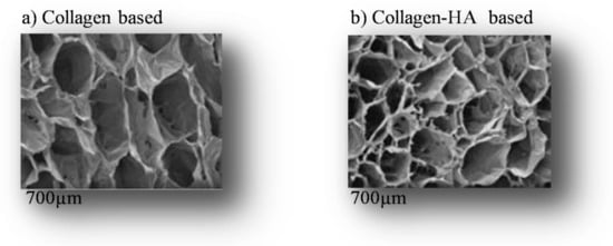 Scanning Electron Microscopy micrographs of the longitudinal sections of freeze-dried scaffolds of (a) collagen-based and (b) collagen-HA based (adapted from []).