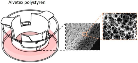 Alvetex® hard-base scaffolding (Figure 2) provides a large internal volume and 3D space that cells can occupy and form a tissue. Cells find a more physiological shape because they are not seeded on a flat surface but in the presence of fibers or sponge-shaped structures with high consistency and reproducibility []. These scaffolds are composed of non-degradable inert materials (polystyrene or polycaprolactone PCL) to avoid the formation of by-products. They can be manufactured by electrospinning [,,] or by gas foam technology [] to improve their application in cell culture, but very few have been developed into a commercially successful process for 3D culture (Table 2). They are important tools in the study of cell-ECM interactions due to the ability of the scaffolding to reproduce the structure of the ECM and high porosity [,]. Moreover, it is less affected by cytotoxic compounds. Polystyrene is a familiar substrate to the user in 3D cell culture since it is inert and does not degrade during normal use [,,,,] (Table 3). On the other hand, polystyrene has some disadvantages: it is rigid (its rigidity must be controlled), does not have the biomechanical properties found in soft tissues, can display cytotoxicity [], and a lack of biochemical stimuli (for example, molecules dependent on cell anchorage). However, these can be solved by adding known ECM proteins. In this case, a balance must be found between the needs of the model and the objective of the study [].