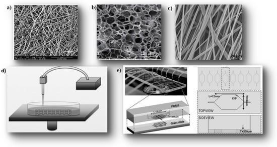 Despite the good biocompatibility of hydrogels due to their water content, they most often have low mechanical properties and high degradation rates. For this, porous materials have been designed with interconnected pore networks and surfaces or fibers to support cell adhesion. These materials are discriminated against 3D models of ECM of nano porous scaffolding where pore structures are in the range of cell diameter (about 10 μm) [,,,] (Figure 3a). Nevertheless, microporous structures allow more efficient cell penetration and migration into the material but with specific pore sizes since a micro-size can represent a barrier to cellular colonization of the material and limit cellular interactions at the edges of the material []. Like hydrogels, porous materials can be prepared with natural and synthetic polymers by different techniques, including electrospinning, phase separation, model creation, and vapor polymerization []. The porosity based is mainly used with synthetic polymers (PLA/glycolic acid and PCL) but is also suitable for natural polymers such as collagen and silk fibroin []. For example, porous collagen materials, due to their high porous structures, make so-called “collagen sponges”, by thermally induced phase separation. The phase separation of collagen molecules from the water-based solvent is due to the freezing of acidic collagen solution, which induces one that is then eliminated by freeze-drying. Pore size and interconnectivity can be altered by modulating collagen concentration and phase separation temperature or by mixing collagen solutions with other natural polymers such as GAG [] or synthetic polymers such as PLA. The low mechanical properties of freeze-dried collagen materials are often enhanced by the addition of GAG by cross-linking them with chemical species (aldehydes) using dehydrothermal processes [].