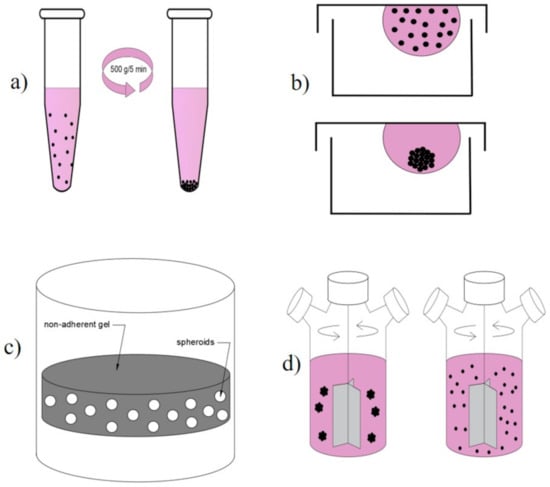 Technical methods of spheroid formation: (a) Pellet culture; (b) Hanging drop; (c) Liquid overlay; (d) Spinner culture.