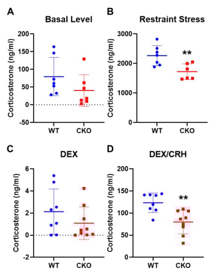 CKO mice have reduced corticosterone levels after restraint stress and in DEX/CRH testing. (A,B) Corticosterone concentration in basal (A) and restraint stressed conditions (B) in WT (n = 7) and CKO (n = 7) mice. (C,D) DEX/CRH test. The corticosterone level after DEX treatment (C) and then CRH challenge (D) in WT (n = 13) and CKO (n = 14) mice. Results are presented as means ± SD, ** p ≤ 0.01, compared with the WT group.