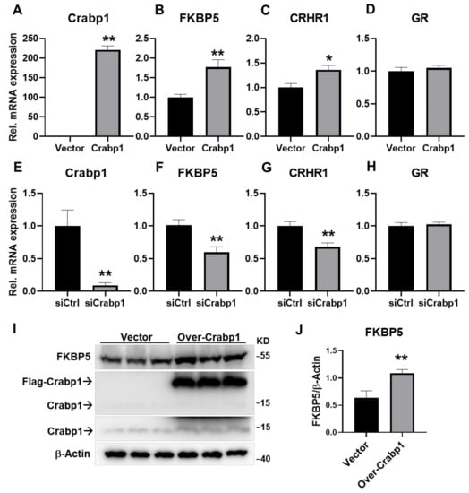 Changes in mRNA levels of Crabp1, FKBP5, CRHR1, and GR and FKBP5 protein levels in AtT20 cells with elevated (over-expression) or lowered (silencing) Crabp1 levels. (A–D) mRNA levels of key genes in Crabp1-elevated AtT20 cell (n = 6/groups). (E–H) mRNA levels of key genes in Crabp1-lowered AtT20 cell (n = 6/groups). (I,J) Changes in FKBP5 protein levels upon Crabp1-expression. Labels are indicated as “Vector” = Empty vector control; “Over-Crabp1” = Crabp1 overexpression; “# Crabp1” = endogenous Crabp1 imaged with a short (top) or long exposure time (bottom). β-actin was used as a loading control. Results are presented as means ± SEM, * p ≤ 0.05, ** p ≤ 0.01, compared with the Ctrl group.