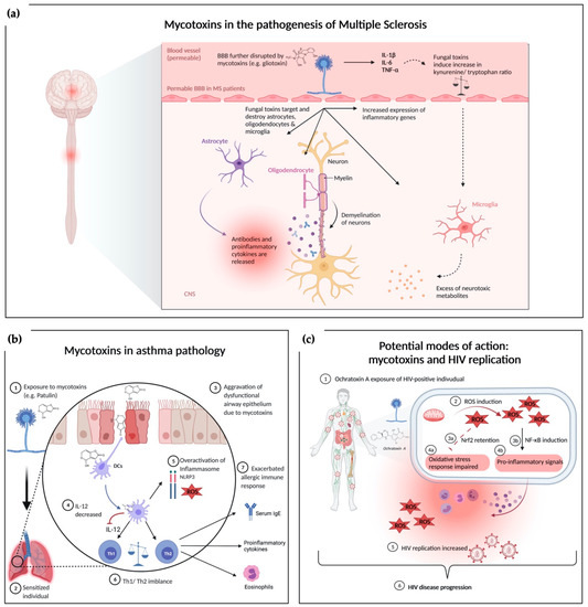 Overview of mechanisms underlying the exacerbating effects of mycotoxin exposure under a dysregulated immune system. (a) Mycotoxins in the pathogenesis of MS: exposure to GTX alters the blood brain barrier [98]. Mycotoxins affect neural tissue by damaging astrocytes, oligodendrocytes, and microglia. Loss of oligodendrocytes leads to further demyelination while targeted astrocytes release proinflammatory cytokines contributing to the neuroinflammatory environment. Another direct effect of mycotoxins is the induction of proinflammatory gene expression in the CNS. Indirect pathways via proinflammatory cytokines like IL-1 are hypothesized to interact with microglia through an augmented kynurenine/tryptophan ratio, which promotes the secretion of neurotoxic metabolites. (b) Mycotoxins in asthmatic conditions: exposure to mycotoxins worsens the respiratory epithelium barrier impairment. Dendritic cells take up mycotoxins leading to a decreased production of IL-12 and an increased ROS production as well as overactivation of the inflammasome. IL-12 reduction further emphasizes the Th1/Th2 imbalance contributing to the increased airway inflammation in asthmatic mouse model (c) Potential modes of action between mycotoxin exposure and HIV replication: exposure to mycotoxins modulates immune response via induction of ROS. ROS inhibits oxidative defense machinery via Nrf2 retention and induces proinflammatory response via NF-κB induction. Both, mycotoxin related oxidative stress and proinflammatory signals could potentially contribute to an increased HIV burden and disease progression. Figure 1a adapted from “Allergic airway sensitization”, by BioRender.com (2021). Retrieved from https://app.biorender.com/biorender-templates; Figure 1b adapted from “Pathogenesis of Multiple Sclerosis”, by BioRender.com (2021). Retrieved from https://app.biorender.com/biorender-templates.