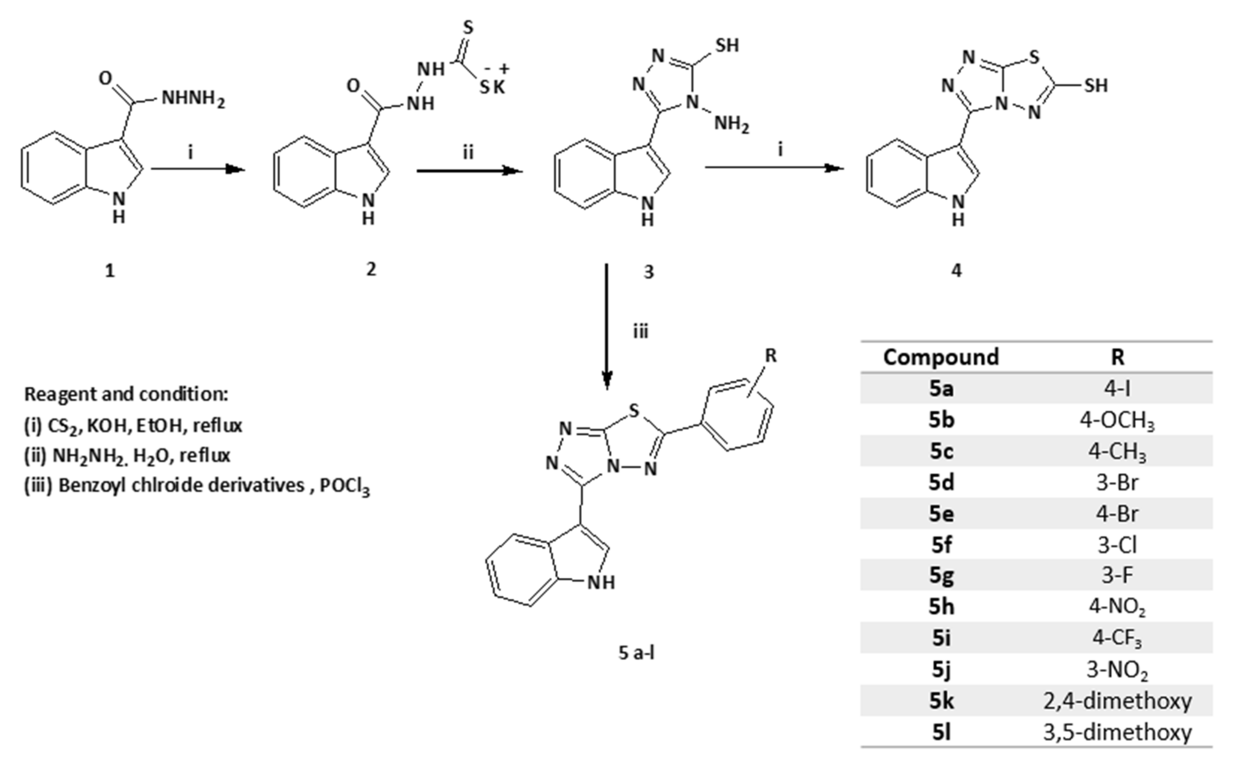 4.1.3. General Preparation Procedure of 3-(6-Substituted phenyl-[1,2,4]-triazolo[3,4-b]-[1,3,4]-thiadiazol-3-yl)-1H-indol (5a–l)