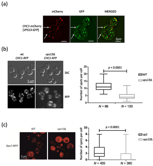 The first vps13 mutant was isolated as secreting CPY [23]. Later, the direct requirement of Vps13 protein for clathrin-dependent transport from the Golgi to the endosomes was shown in vitro. The same study demonstrated a Vps13 requirement for homotypic fusion of the Golgi membranes in vitro [22]. We also showed that Vps13 is required for endocytosis [20]. Vps13 was also found in association with endosomes, recruited there by an interaction with the Ypt35 adaptor protein [18,45] or by an interaction with PI(3)P [19,20]. To further explore the role of Vps13 in trafficking, especially in the late secretory pathway and in endocytosis, we investigated the co-localization of Vps13 tagged with green fluorescence protein, Vps13-GFP, with clathrin. Clathrin is a complex built of light and heavy chains that forms a coat surrounding the emerging vesicle [46]. Clathrin is required at the Golgi for vesicular transport to endosomes (for cargos such as CPY) and in endocytosis [47,48], which are Vps13-dependent processes. As shown in Figure 1a, Vps13-GFP localized to internal punctate structures, some of which contained clathrin heavy chain (Chc1) protein tagged with mCherry, Chc1-mCherry. Next, we asked whether Vps13 is important for the formation of clathrin spots. To answer this question, we counted the number of clathrin spots (Chc1-RFP) that form in the wild-type (WT) and in vps13Δ mutant cells. In the vps13Δ cells, the number of spots was significantly reduced (Figure 1b), whereas the level of Chc1-RFP was not changed (Figure S1a). This finding is in agreement with a partial impairment of clathrin-dependent trafficking in the vps13Δ mutant [25,49,50].