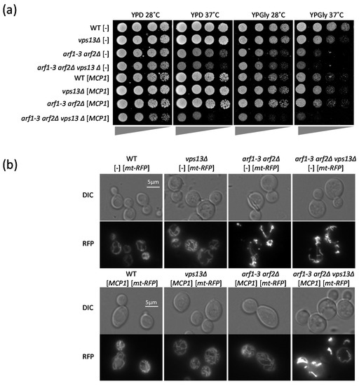 In order to confirm that Vps13 really has an Arf1-independent effect on mitochondrial functions, we tested how overexpression of the MCP1 gene influenced the growth of our strains of interest on YPGly. The overexpression of MCP1 improved the growth of the arf1-3 arf2Δ strain on YPGly at both 28 °C and 37 °C (Figure 2a). Moreover, the presence of Vps13 was necessary for the MCP1-dependent suppression of this growth defect, because in the arf1-3 arf2Δ vps13Δ strain overexpression of MCP1 did not improve growth (Figure 2a). Next, we asked whether overexpression of MCP1 improves the morphology of mitochondria in the arf1-3 arf2Δ strain. To this end, the WT, vps13Δ, arf1-3 arf2Δ, and arf1-3 arf2Δ vps13Δ strains were transformed with a plasmid encoding mt-RFP, an RFP protein fused to a mitochondrial targeting sequence [55], and an empty plasmid, or a plasmid encoding Mcp1. Analysis of the images showed that overexpression of MCP1 helped to restore normal mitochondrial morphology in the arf1-3 arf2Δ strain, but did not in the arf1-3 arf2Δ vps13Δ strain (Figure 2b). This means that Mcp1 rescues the morphology of mitochondria in an arf1-3 arf2Δ strain only in the presence of Vps13.