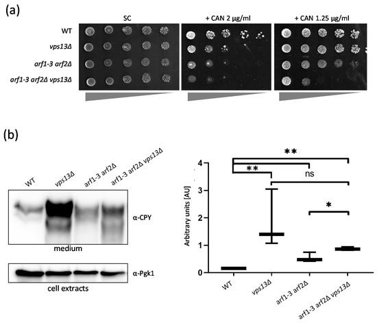 Next, we tested the genetic relationship between the vps13Δ and arf1-3 arf2Δ mutations in other processes. The endocytic defect of vps13Δ cells is the reason for hypersensitivity to canavanine, an arginine analogue [20], whereas the sorting defect causes an enhanced secretion of CPY [56]. The Arf1 GTPase, similar to Vps13, participates in endocytosis and protein vesicular transport [57]. Thus, it is likely that both of these proteins cooperate in these trafficking processes. A comparison of growth rates for WT, vps13Δ, arf1-3 arf2Δ, and arf1-3 arf2Δ vps13Δ strains on L-canavanine (CAN)-containing plates showed that arf1-3 arf2Δ is even more sensitive to this compound than the vps13Δ strain and that this sensitivity is increased further in the arf1-3 arf2Δ vps13Δ strain (Figure 3a). This finding suggests that Vps13 and the Arf1 GTPase work separately in endocytosis.