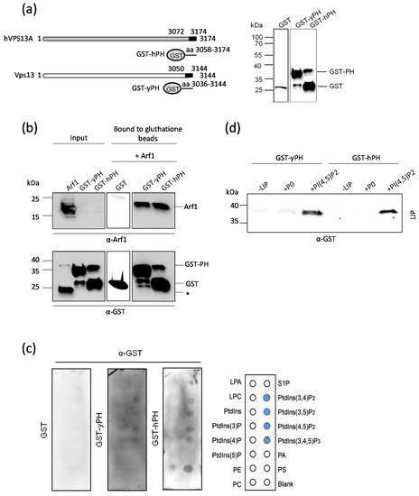 It is known from the literature that domains from the PH family also exhibit an ability to bind phospholipids [36,58]. We tested whether the PH-like domains present in Vps13 and VPS13A could interact with lipids, in addition to their interaction with Arf1. Purified recombinant GST-yPH and GST-hPH were tested for specific interactions with glycerophospholipids using a protein lipid overlay assay. Both yPH and hPH domains exhibited binding to phosphatidylinositol 3,4-bisphosphate (PI(3,4)P2), phosphatidylinositol 3,5-bisphosphate (PI(3,5)P2), PI(4,5)P2, and phosphatidylinositol 3,4,5-trisphosphate (PI(3,4,5)P3) (Figure 4c). These interactions appeared to be weak, similar to what has been described for many PH domains [58]. Therefore, we next investigated the binding of GST-yPH and GST-hPH to liposomes. Because earlier work by De et al. showed that the C-terminal part of Vps13 bound only to PI(4,5)P2 [22], we used liposomes enriched with this lipid. For controls, recombinant proteins were incubated with liposomes that were not enriched in PIPs (+P0) or without liposomes entirely (-LIP). Both GST-yPH and GST-hPH proteins bound efficiently to liposomes containing PI(4,5)P2, whereas no binding to control liposomes (P0) was observed (Figure 4c). This indicates that the PH-like domain is most likely responsible for the binding of the yeast Vps13 protein to PI(4,5)P2, and the C-terminal fragment of VPS13A also binds to this lipid.