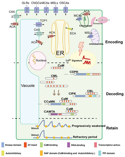 Three major processes implicated in Ca2+ signal stimulus-induced dynamic alterations: encoding, decoding and retaining. Ca2+ encoding is mediated by Ca2+ channels, Ca2+-ATPases, Ca2+/H+ exchangers, channels named CNGCs, GLRs, TPCs, MCAs, MSLs, OSCA1, ATPases named ACAs, ECAs, and the antiporter named CAX; besides this, annexins without EF-hand domains are also involved in Ca2+ influx. The decoding is composed of many different protein families. CaMs, CMLs and CBLs harbor EF hand domains and regulate target proteins without any additional functional domains. CBLs modulate the activity of CIPKs interacting with NAF and PPI domain, while CDPKs are directly activated by Ca2+ binding to the CaM-like domain. In contrast to CDPKs, CCaMKs are dual-regulated kinases. These proteins bind Ca2+ via a visinin-like domain, while in addition, Ca2+-CaM binds to the regulatory domain of the kinase and mediates further activation. CAMTAs activate the transcription of related genes by interacting with CaM. Ca2+ signatures retain a steady-state concentration under the same stimulation for a short period through persistent decaying or during a refractory period. Colored modules represent different functional structures. The black lines with an arrow indicate the direction of Ca2+ flow, and the black curve with an arrow indicates the ATP decomposition reaction (ATP to ADP).