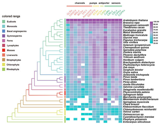 Similarity heat map for the evolution of Ca2+ signaling relative proteins, containing channels, pumps, antiporters, and sensors in different plant and algal species. Candidate protein sequences were selected by BLASTP searches which satisfied E value < 10−10 and query coverage > 50% [7]; colored squares indicate a protein sequence similarity from 20% (blue) to 100% (purple). White squares indicate proteins that satisfied neither of the selection criteria. GLRs, glutamate receptor-like channels; CNGCs, cyclic nucleotide gated channels; MSLs, mechanosensitive-like channels; MCAs, ‘mid1-complementing activity’ channels; TPC1, two-pore channel 1; OSCA1s, hyperosmolality-induced Ca2+ channel 1; ECAs, endoplasmic reticulum-type Ca2+-ATPases; ACAs, auto-inhibited Ca2+-ATPases; CaMs, calmodulin; CMLs, calmodulin-like protein; CBLs, calcineurin B-like protein; CIPKs, CBL-interacting protein kinases; CDPKs, Ca2+-dependent protein kinases.