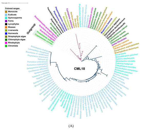 Among the Ca2+ sensors, CDPKs are found in all green plant lineages and red algae (Figure 2), which do not require the involvement of calmodulin owing to their specific structure, and so can directly self-activate and respond to Ca2+ signals [154]. Additionally, family- or species-specific whole genome duplication (WGD) events allow considerable variation in the numbers of CDPK proteins between plant species and clades [10,155]. In parallel, either CMLs or CaMs could be traced to basal lineages of streptophyte algae, among which CMLs exhibited a much lower protein sequence similarity compared to CaMs; however, the number of CMLs largely exceeds that of CaMs (Figure 2 and Figure S2). This can be interpreted such that sequence divergence, even in the EF hand domains, exists among the CMLs, leading to the variant structural properties of Ca2+-binding motifs, and resulting in the separation of the CMLs from CaMs [141,156]. CML18 (At3g03000) was clearly indicated as interacting with vacuolar Na+/H+ antiporters more than a decade ago [157]. Evolutionary and phylogenetic analysis suggested that CML18 is present in chlorophytes and Rhodophyta. However, compared with the evolutionary analysis of CaM1 reported in the previous study [106], CML18 showed two unique evolutionary clades in red algae (Figure 3A). These distinctions indicate that CMLs may have evolved earlier than CaMs and may have diversified later [145].