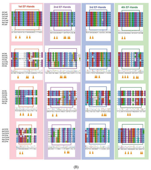 Ca2+ signaling components show a greater increasing rate of diversity than other proteins. CMLs are the most primitive EF-hand containing proteins, and subsequently, some CMLs evolved into CaMs, following which, CaMs may have merged with protein kinases to generate Ca2+-dependent kinases with diverse and distinct functions [162]. Thus, the EF-hand domains may give rise to a diversity of compositions and structures, which makes it easy to acquire new functional interactions [163]. CaMs maintain a high level of sequence conservation in evolution, with the existence of D-x-D motifs in all 1st EF-hands, 2nd EF-hands, 3rd EF-hands, and 4th EF-hands—which is consistent with previous studies (Figure 3B) [11]. However, CMLs contain only one F-D-x-D and D-x-D-x-D motif in the 3rd and 4th EF-hand, respectively; the rest of the EF-hands contain F-x2-F or E-F-x-E-F, which suggests that other residues have been substituted D (Asp) in CMLs. There are three EF-hands in CDPKs possessing D-x-D motifs, exhibiting a considerable structural similarity. Given the effects of molecular interaction mechanisms, CBLs have a greater degree of differentiation in their EF structure and possess only one D-x-D motif in their 4th EF-hand (Figure 3B). Therefore, the understanding of EF-hand-containing proteins demonstrates that duplication and loss events have occurred in the evolutionary process of EF-hand molecules, of which duplication preceded loss events [9,11].
