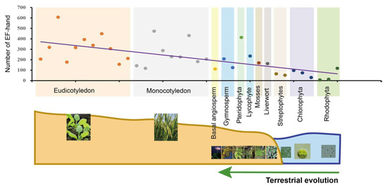Statistics and analysis of the quantity of EF-hand domains in 35 plants and algal species. These species were classified into 11 evolutionary clades indicated by different colors. Each point in the different colors, arranged by evolutionary process, represents one species each. The same-color points are located at the same evolutionary stage. Fitted trendlines indicate that the quantity of EF-hand domains is increasing. Relevant data was integrated with superfamily databases and local retrieval was performed with the Hidden Markov Model (HMM) using hmmsearch (http://www.hmmer.org/; accessed on 13 June 2021).