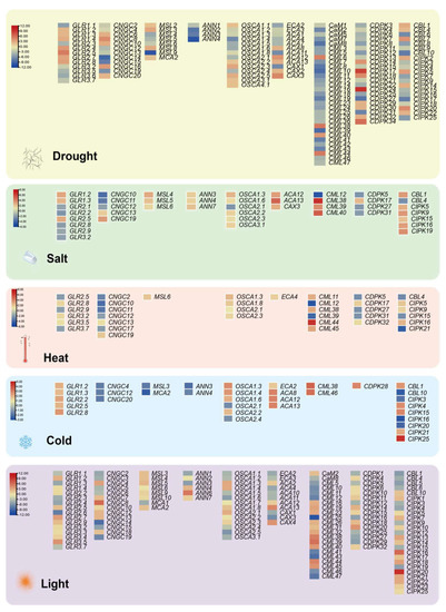 DEGs-based integrated expression profiles of Ca2+ singling genes in drought, salt, heat, cold and light. DEGs are filtered in the Expression Atlas databases with the following setting parameters: adjusted p-value < 0.001, |log2[fold change]| > 1. Red, up-regulated; Yellow, non-changed; Blue, down-regulated. The scale of the different stress modules also slightly varies.
