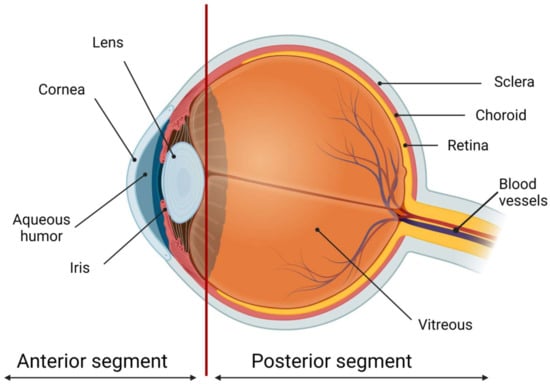 The scheme of the eye. The ocular globe can be conditionally divided into two parts: the anterior segment and the posterior segment. The anterior eye segment consists of the cornea, conjunctiva, iris, ciliary body, lens, and aqueous humor, while the sclera, choroid, retina, and vitreous body form the posterior segment. Created with BioRender.com.