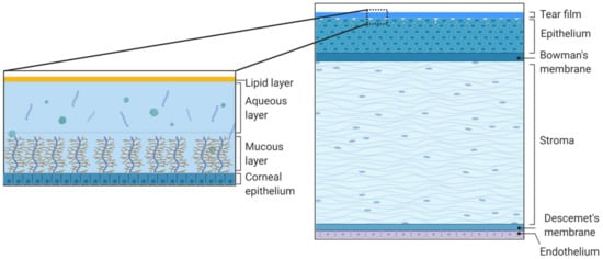 Schematic representation of the structure and composition of the cornea and the tear film. The cornea consists of the tear film, epithelium, Bowman’s membrane, stroma, Descemet’s membrane, and inner endothelium. The tear film consists of the outer lipid phase, intermediate aqueous phase, and mucus. Created with BioRender.com.