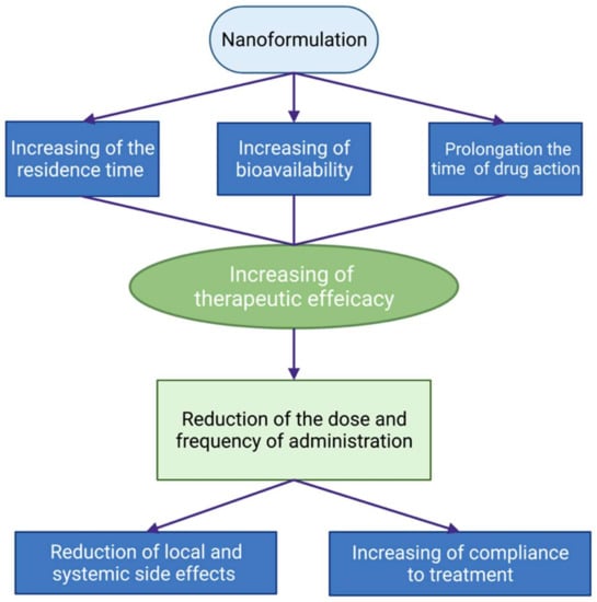 The principal problems in ocular drug delivery via topical administration are poor permeability of tissues and short residence time in the tear film. So, two main strategies have been followed to improve ocular bioavailability upon topical administration: (a) increasing pre-corneal retention time, and (b) enhancing corneal, scleral, and/or conjunctival drug permeability []. To overcome the ocular drug delivery barriers and improve the drug bioavailability, various conventional and novel drug delivery systems have been developed such as emulsions, ointments, suspensions, aqueous gels, nanomicelles, nanoparticles, liposomes, dendrimers, implants, contact lenses, nanosuspensions, microneedles, in situ thermosensitive gels, etc. Among these, nanosize carriers are the most attractive, as they could enhance drug permeability across the blood-aqueous barrier and cornea, prolong drug contact time with ocular tissues, deliver drugs to a specific tissue in a controlled manner, protect drugs from degradation and metabolism to enhance drug stability, sustain drug release for a long time, diminish toxicity and side effects, maintain long shelf-life, while not needing to reconstitute or surgical removal [].