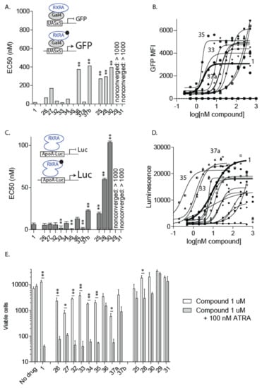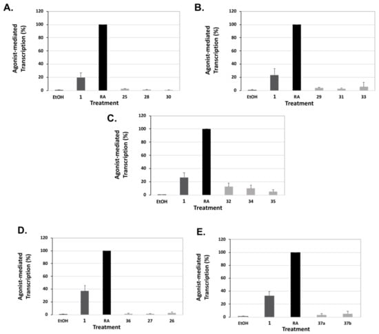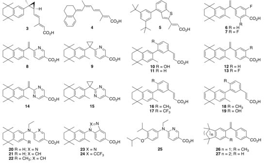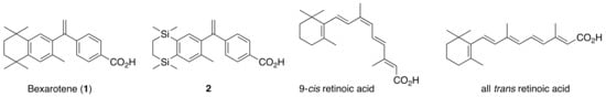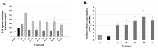 The LXRE-mediated assays were performed using human embryonic cells (HEK293) seeded at a density of 60,000 cells/well in a 24-well plate and maintained in DMEM (Hyclone) supplemented with 10% fetal bovine serum, 100 µg/mL streptomycin, 100 U/mL penicillin (Invitrogen, Carlsbad, CA, USA) at 37 degrees Celsius, 5% CO2 for 24 h. The cells were co-transfected with 250 ng of an LXRE-luciferase reporter gene, 50 ng of pSG5-human RXRα, and 20 ng of renilla control plasmid. The transfections were conducted using 1.25 µL of polyethylenimine (PEI) (Polysciences, Inc., Warrington, PA, USA) for 16–22 h. After transfection, the cells were treated with either ethanol vehicle control (0.1%), reference compound bexarotene (1) or analog, and/or T0901317 (an LXR ligand) at the indicated concentrations. After 24 h post treatment, the cells were lysed and the transcriptional activity mediated by the LXRE was measured using the Dual Luciferase Assay System (Promega, Madison, WI) in a Sirius FB12 luminometer (Berthold Detection Systems, Pforzheim, Germany) according to the manufacturer’s protocol. The data are a compilation of between three and six independent assays with each treatment group dosed in triplicate for each independent assay. The transcription efficiency on the LXRE was measured in comparison to the reference compound bexarotene (1) set to 100%. Bars on all graphs indicate standard deviation of the replicate experiments.