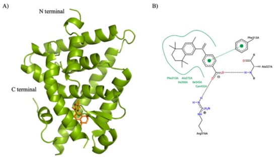 The three-dimensional structures of the compounds reported herein were generated using ChemDraw 3D (PerkinElmer Informatics), energy minimized, and exported in the Protein Data Bank (PDB) format. The human RXR alpha ligand binding domain structure model was obtained from the PDB (PDB code: 1FBY, [
