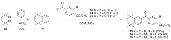 To a 250 mL flask, 4-(methoxycarbonyl)benzoic acid (3.535 g, 19.62 mmols) was treated with thionyl chloride (30.0 mL), resulting in a quantitative crude yield of methyl 4-(chlorocarbonyl)-benzoate (64) after the removal of thionyl chloride. Acid chloride 64 and compound 71 (4.0404 g, 21.45) were dissolved in 30 mL of DCM and aluminum chloride (4.18 g, 31.34 mmols) was slowly added followed by heating in an oil bath at 55 °C for 15 min. The reaction was quenched in 100 mL of ice water, the product was extracted with ethyl acetate, dried over sodium sulfate, and purified by column chromatography (300 mL silica gel, 2.5% ethyl acetate:hexanes to 20% ethyl acetate: hexanes) to give pure 74 (5.3353 g, 77.6%) as an off-white crystalline solid, mp 136.9–139.8 °C: 1 H NMR (400 MHz, CDCl3) δ 8.16 (dd, J = 6.8, 2.0, 2H), 7.83 (dd, J = 6.8, 2.0, 2H), 7.78 (d, J = 2.0, 1H), 7.53 (dd, J = 8.4, 2.0, 1H), 7.40 (d, J = 8.4, 1H), 3.96 (s, 3H), 1.72 (s, 4H), 1.31 (s, 6H), 1.29 (s, 6H); 13C NMR (100.6 MHz, CDCl3) δ 195.9, 166.4, 150.7, 145.2, 141.8, 134.1, 132.8, 129.6, 129.3, 128.8, 127.3, 126.7, 52.4, 34.8, 34.7, 34.7, 34.4, 31.7, 31.6. ES-MS (M + H)+ calcd for C23H27O3 351.1960, found 351.1978.