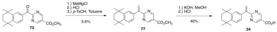 6.48. 2-(1-(5,5,8,8-tetramethyl-5,6,7,8-tetrahydronaphthalen-2-yl)vinyl)pyrimidine-5-carboxylic acid (34)