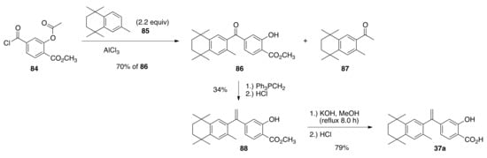 To a 100 mL round bottom flask charged with 3-acetoxy-4-(methoxycarbonyl)benzoic acid (83) (3.236 g, 13.59 mmols) was added thionyl chloride (22 mL, 300 mmols) and a few drops of DMF. A water condenser was added to the flask, and the solution was refluxed in an oil bath for 1.2 h to give methyl 2-acetoxy-4-(chlorocarbonyl)benzoate (84) in quantitative yield after the excess thionyl chloride was removed in vacuo. To the 100 mL round bottom flask containing 84 was added 1,1,4,4,6-pentamethyl-1,2,3,4-tetrahydronaphthalene (85) (6.0508 g, 29.9 mmols) and DCM (30 mL). To the resulting homogeneous solution was slowly added aluminum chloride (3.0 g) at room temperature, with the observed evolution of gas, and the reaction was refluxed for 15 min at 55 °C in an oil bath. The reaction solution was cooled to 0 °C in an ice bath and poured onto 100 mL of an ice water solution. The layers were separated, and the aqueous layer was extracted with ethyl acetate. The combined organic layers were washed with water and then brine, dried over sodium sulfate, filtered, and concentrated in vacuo to give a crude product that was purified by column chromatography (250 mL SiO2) with 1.5% to 5% ethyl acetate/hexanes to give 86 (3.64 g, 70%) as a white solid, m.p. 104.2–106.3 °C: 1H NMR (400 MHz, CDCl3) δ 10.78 (s, 1H), 7.93 (d, J = 8.0, 1H), 7.33 (d, J = 1.2, 1H), 7.31 (dd, J = 8.0, 1.6, 1H), 7.27 (s, 1H), 7.18 (s, 1H), 3.99 (s, 3H), 2.32 (s, 3H), 1.68 (s, 4H), 1.30 (s, 6H), 1.20 (s, 6H); 13C NMR (100.6 MHz, CDCl3) δ 197.5, 170.0, 161.3, 148.3, 144.5, 141.8, 134.5, 134.4, 129.9, 129.3, 128.3, 119.8, 119.4, 115.2, 52.6, 34.9, 34.8, 34.3, 33.8, 31.7, 31.6, 20.0. ES-MS (M + Na)+ calcd for C24H28O4Na 403.1885, found 403.1888.