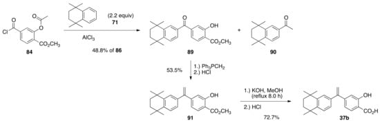 To a 100 mL round bottom flask charged with 3-acetoxy-4-(methoxycarbonyl)benzoic acid (83) (4.7646 g, 20.00 mmols) was added thionyl chloride (32 mL, 440 mmols) and a few drops of DMF. A water condenser was added to the flask, and the solution was refluxed in an oil bath for 1.2 h to give methyl 2-acetoxy-4-(chlorocarbonyl)benzoate (84) in quantitative yield after the excess thionyl chloride was removed in vacuo. To the 100 mL round bottom flask containing 84 was added 1,1,4,4-tetramethyl-1,2,3,4-tetrahydronaphthalene (71) (7.4885 g, 39.8 mmols) and DCM (45 mL). To the resulting homogeneous solution was slowly added aluminum chloride (6.7750 g) at room temperature, with the observed evolution of gas, and the reaction was refluxed for 15 min at 55 °C in an oil bath. The reaction solution was cooled to 0 °C in an ice bath and poured onto 100 mL of an ice water solution. The layers were separated, and the aqueous layer was extracted with ethyl acetate. The combined organic layers were washed with water and then brine, dried over sodium sulfate, filtered, and concentrated in vacuo to give a crude product that was purified by column chromatography (250 mL SiO2) with 1.5% to 5% ethyl acetate/hexanes to give 89 (3.5757 g, 48.8%) as white solid, m.p. 76.7–81.3 °C: 1H NMR (400 MHz, CDCl3) δ 10.82 (s, 1H), 7.95 (d, J = 8.4, 1H), 7.81 (d, J = 1.6, 1H), 7.53 (dd, J = 8.4, 1.6, 1H), 7.39 (d, J = 8.0, 1H), 7.32 (d, J = 1.2, 1H), 7.25 (dd, J = 8.0, 1.6, 1H), 3.95 (s, 3H), 1.71 (s, 4H), 1.31 (s, 6H), 1.29 (s, 6H); 13C NMR (100.6 MHz, CDCl3) δ 195.4, 170.0, 161.1, 150.8, 145.2, 144.5, 133.8, 129.8, 128.8, 127.4, 126.6, 119.8, 118.8, 114.6, 52.6, 34.8, 34.7, 34.6, 34.3, 31.7, 31.5; ES-MS (M + Na)+ calcd for C23H26O4Na 389.1729, found 389.1728.