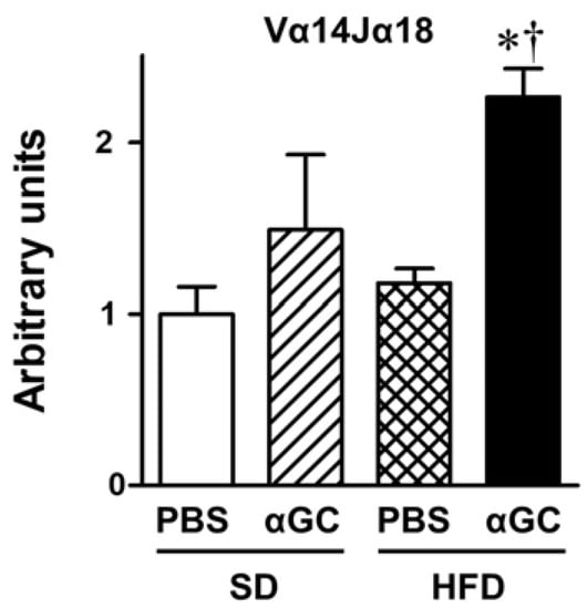 iNKT cell accumulation into aortic tissues quantified by Vα14/Jα18 gene expression was comparable between the SD-PBS and the HFD-PBS groups. αGC injection significantly enhanced iNKT cell accumulation in the HFD-αGC group, but not in the SD-αGC group (Figure 1).
