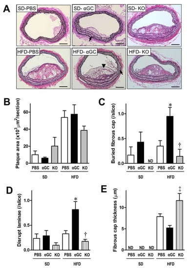 Histomorphometric analysis at the brachiocephalic artery from six groups of SD-PBS (n = 6), SD-αGC (n = 7), SD-KO (n = 3), HFD-PBS (n = 21), HFD-αGC (n = 21), and HFD-KO (n = 9) mice. (A) Representative photomicrographs of elastica-van Gieson’s staining of cross-sections. Scale bar = 100 μm. In HFD-PBS, HFD-αGC, and HFD-KO mice, arrows indicate disrupted elastic laminae and an arrowhead indicates buried fibrous cap. Summary data of plaque area (B), the number of buried fibrous caps (C), the number of disrupted elastic-laminae (D), and the maximal fibrous cap thickness (E) from six groups of mice. * p < 0.05 vs. HFD-PBS, † p < 0.05 vs. HFD-αGC, and ‡ p < 0.01 vs. HFD-αGC by ANOVA. All data are expressed as means ± S.E. ND, not determined.