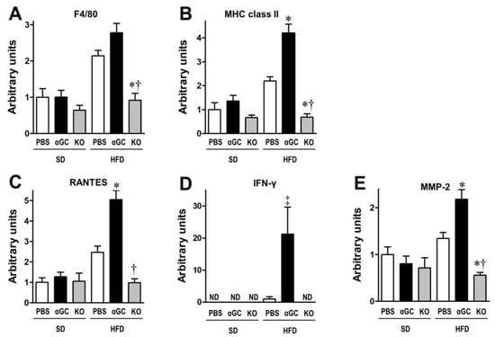 Gene expression of F4/80 (A), major histocompatibility complex (MHC) class II (B), regulated upon activation normal T cell expressed secretion (RANTES; (C)), interferon (IFN)-γ (D), and matrix metalloproteinase (MMP)-2 (E) in aortic tissues from six groups of SD-PBS (n = 6), SD-αGC (n = 7), SD-KO (n = 3), HFD-PBS (n = 21), HFD-αGC (n = 21), and HFD-KO (n = 9) mice. * p < 0.05 vs. HFD-PBS, † p < 0.01 vs. HFD-αGC by ANOVA, and ‡ p < 0.05 vs. HFD-PBS by student t test. All data are expressed as means ± S.E. ND, not detected.