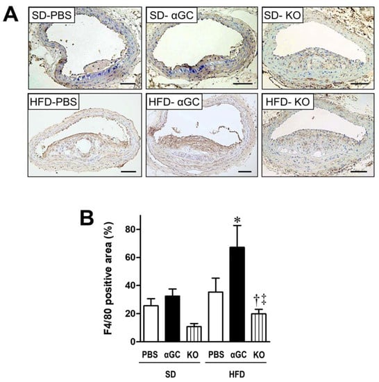 Representative photomicrographs of anti-F4/80 immunohistochemistry of cross-sections at the brachiocephalic artery (A) and summary data of anti-F4/80 positive area (B) from 6 groups of SD-PBS (n = 4), SD-αGC (n = 6), SD-KO (n = 3), HFD-PBS (n = 18), HFD-αGC (n = 16), and HFD-KO (n = 7) mice. Scale bar = 100 μm. * p < 0.01, † p < 0.05 vs. HFD-PBS, and ‡ p < 0.01 vs. HFD-αGC by ANOVA. All data are expressed as means ± S.E.