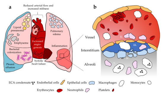 Summary of pulmonary and cardiovascular dysfunction and their cellular basis. (a) EC use has been linked to disease and dysfunction in the heart and lungs. (b) i. Platelets are activated towards a pro-thrombotic phenotype in the vessel; ii. ECA exposure promotes endothelial cell death and compromised barrier function, which facilitates immune cell extravasation into the surrounding tissue. Endothelial cells release inflammatory cytokines that enhance neutrophil recruitment; iii. Monocytes differentiate into macrophages upon extravasation. Neutrophils and macrophages remodel extracellular matrix in the interstitium as an inflammatory response, promoting compromise of the epithelium and endothelium; iv. Epithelial permeability is compromised and ECA exposure is associated with epithelial cell apoptosis and necrosis; v. ECA exposed macrophages and neutrophils enter the lung tissue and promote inflammation. Macrophages take up EC-associated lipids. Not to scale.
