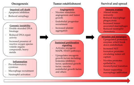 EC use is known to promote several pro-oncogenic phenomena that may support continuing tumor development after initiation (Figure 2). Furthermore, EC use upregulates leukemia inhibitory factor which activates the MAPK and STAT3 pathways, both of which are well established oncogenic signaling pathways; whether ECA modulates these in the context of cancer has not been investigated [126]. Nicotine itself promotes these pathways in endothelial cells, which can reduce apoptosis and impair autophagy, both of which are critical steps in tumor establishment [127,128,129]. ECA also appears to be proinflammatory, which fosters oncogenic transformation when sustained [103,104].