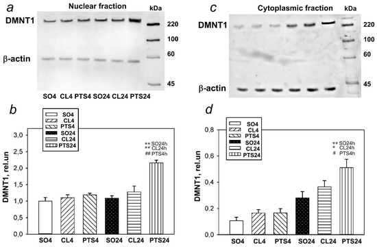 The expression of DNMT1in nuclear (a,b) and cytoplasmic (c,d) fractions of penumbra tissue at 4 or 24 h after photothrombotic stroke (PTS) in the rat cerebral cortex. The significant differences * p < 0.05 and ** p < 0.01 compared to sham-operated animals (SO) or contralateral cerebral cortex of the same animals (CL4 and CL24), # p < 0.05 and ## p < 0.01 compared to the PTS4 are shown. One-way ANOVA. M ± SEM. n = 7. Rel.un—the ratio of the optical density of the strip of the protein studied to the optical density of the strip of the protein load marker (actin).