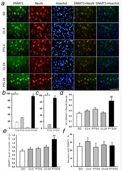An increase by 75% (p < 0.05) in DNMT1 expression in the nuclei of penumbra cells was shown at 24 h after PTS (Figure 2e). At the same time, there was no increase in the number of cells expressing the protein (Figure 2f).