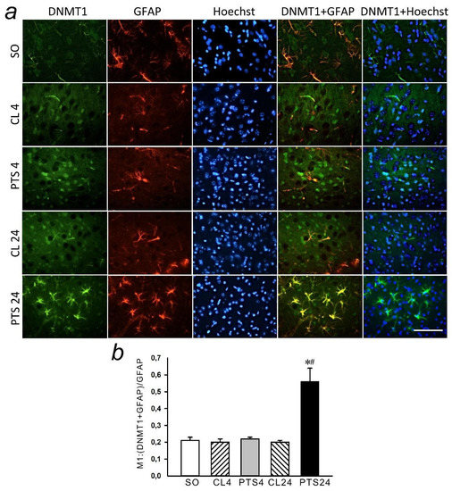 These results were confirmed by the data obtained by immunofluorescence microscopy analysis (Figure 2a–c) that have shown that the level of DNMT1 in the penumbra increased (Figure 2b,c) at 24 h after PTS. A colocalization of DNMT1 with markers of neurons NeuN (Figure 2d) and astrocytes GFAP (Figure 3b) significantly increased.