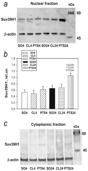 In the present experiments histone methyltransferase SUV39H1 was detected exclusively in the nuclear fraction of the rat cerebral cortex in control samples (Figure 4, Figure 5a and Figure 6a). Its level in the cytoplasm of cells was so low that it was practically not detected by immunoblotting (Figure 4c). The level of SUV39H1 in the nuclear fraction of the penumbra did not change at 4 h after PTS, but it significantly increased at 24 h after PTS (Figure 4a,b).