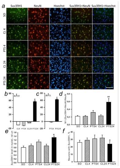 Analysis of SUV39H1 fluorescence in the nucleus of cells revealed an increase by 63% (p ≤ 0.05) in the level of protein in the nuclei (Figure 5e) at 24 h after PTS, while the number of cells expressing the protein was even reduced compared to the indicator in the contralateral hemisphere in the same period by 34% (p ≤ 0.05) (Figure 5f).